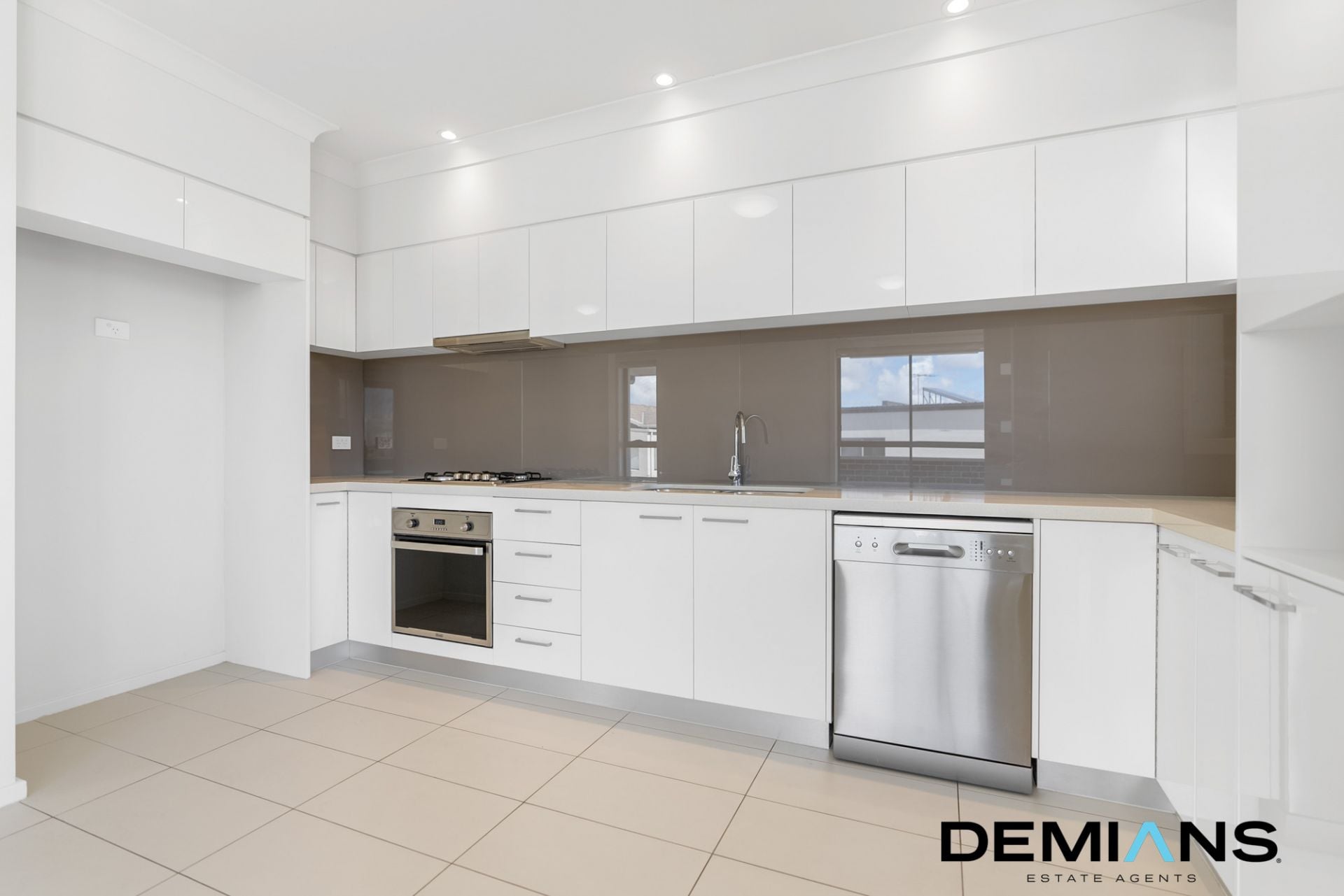 The modern kitchen boasts premium S/steel appliances, a gas cooktop, soft-close drawers, ample cupboard space and Caesarstone benchtops, making meal preparation a breeze. The glass splashback adds a stylish touch to the space.