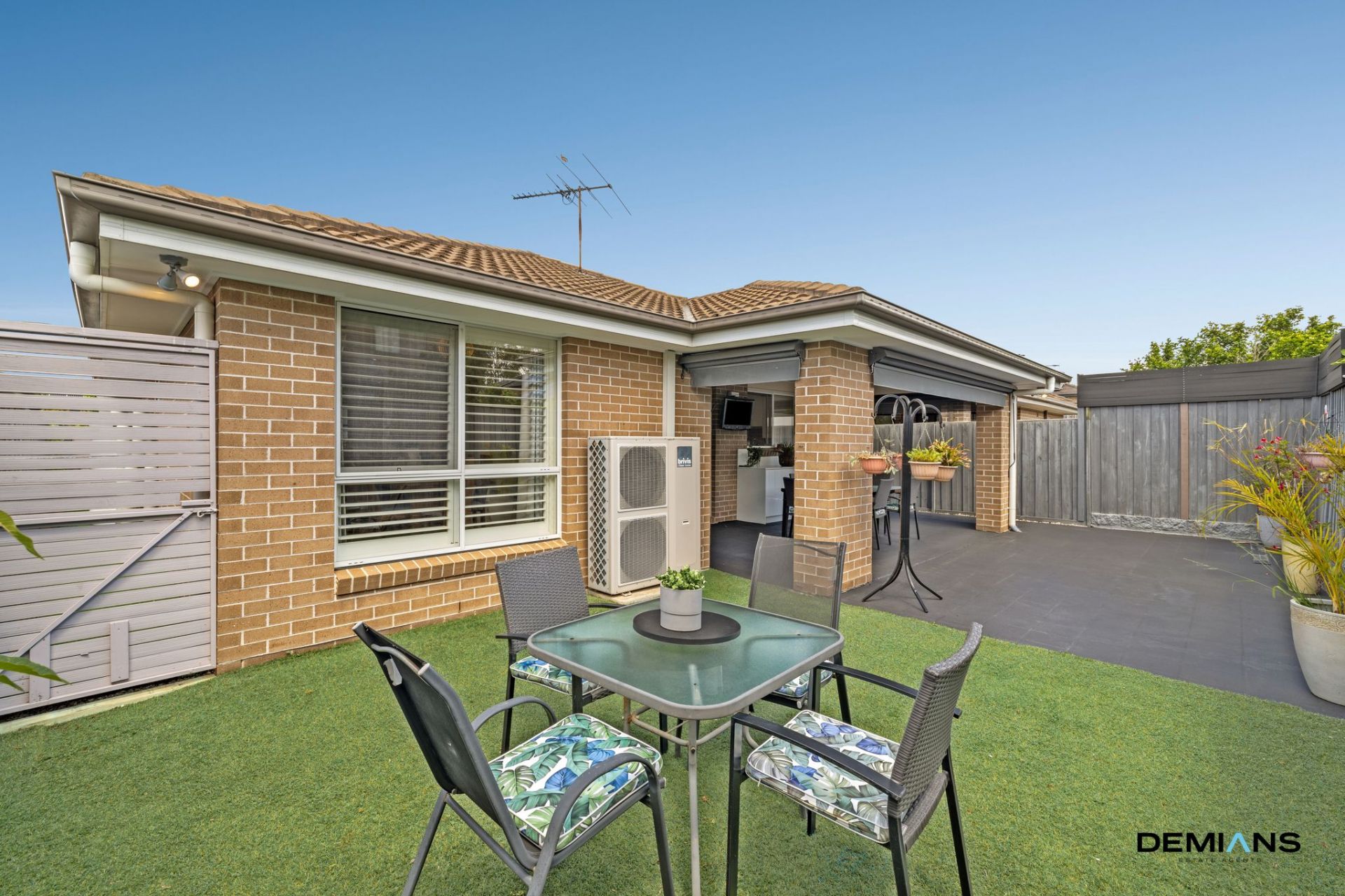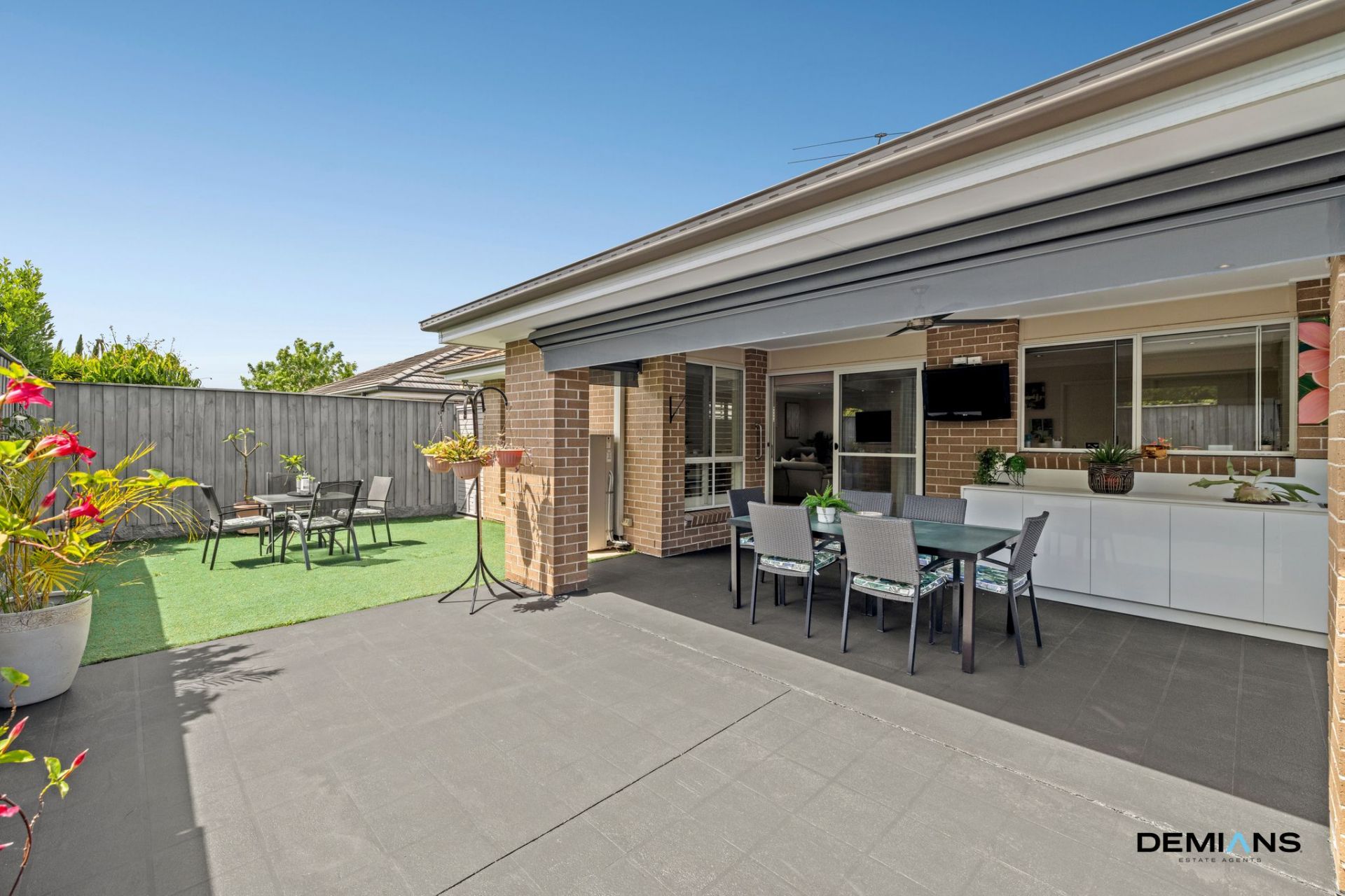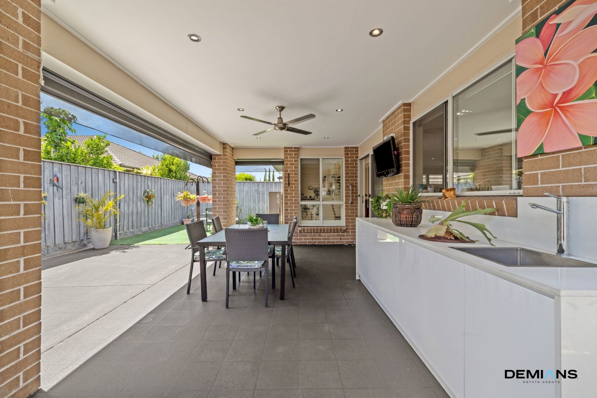 Designed for year round enjoyment, the covered alfresco features a ceiling fan, pull down privacy blinds and a built in outdoor kitchenette overlooking landscaped artificial lawns — a low maintenance setting suited to families or entertainers.