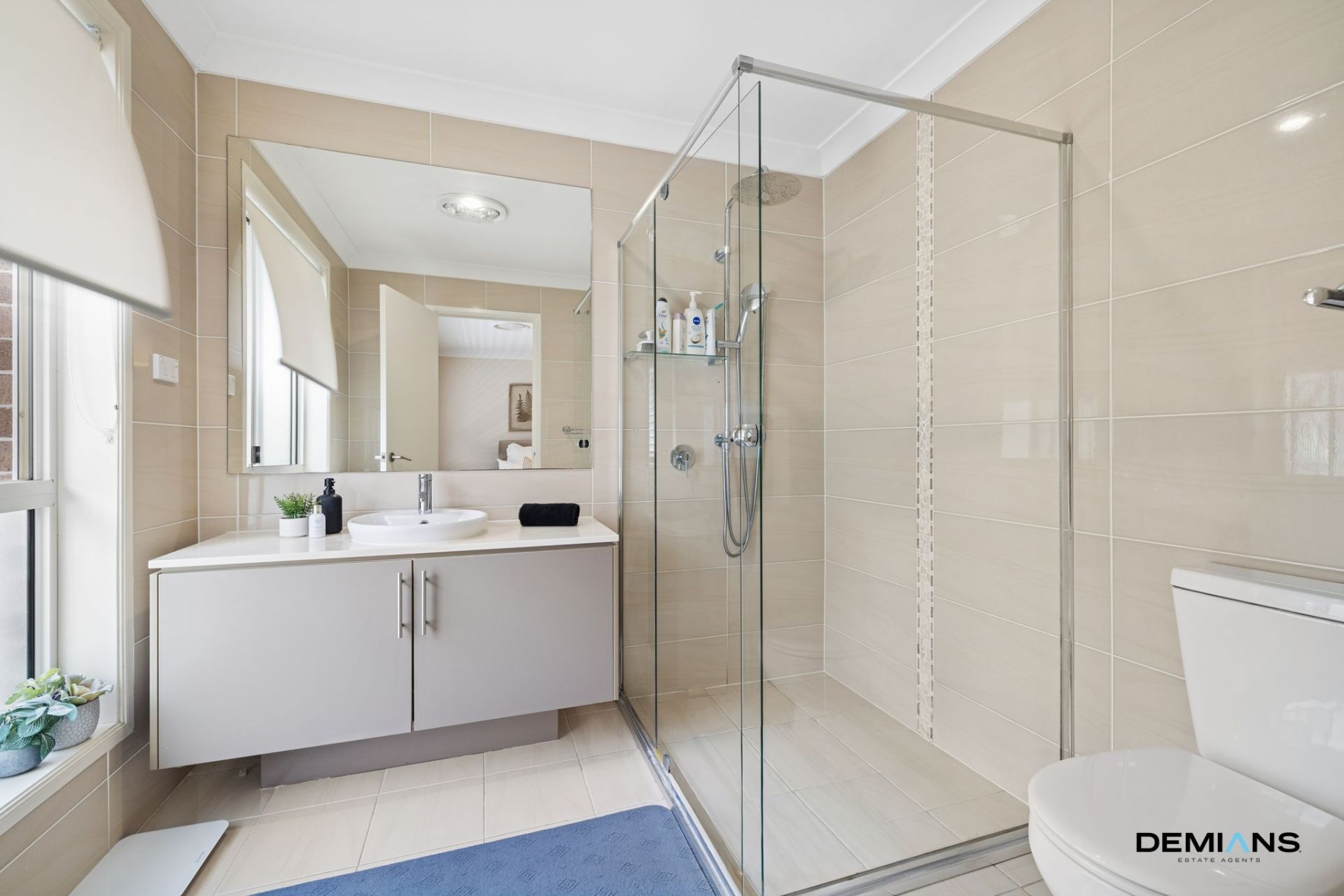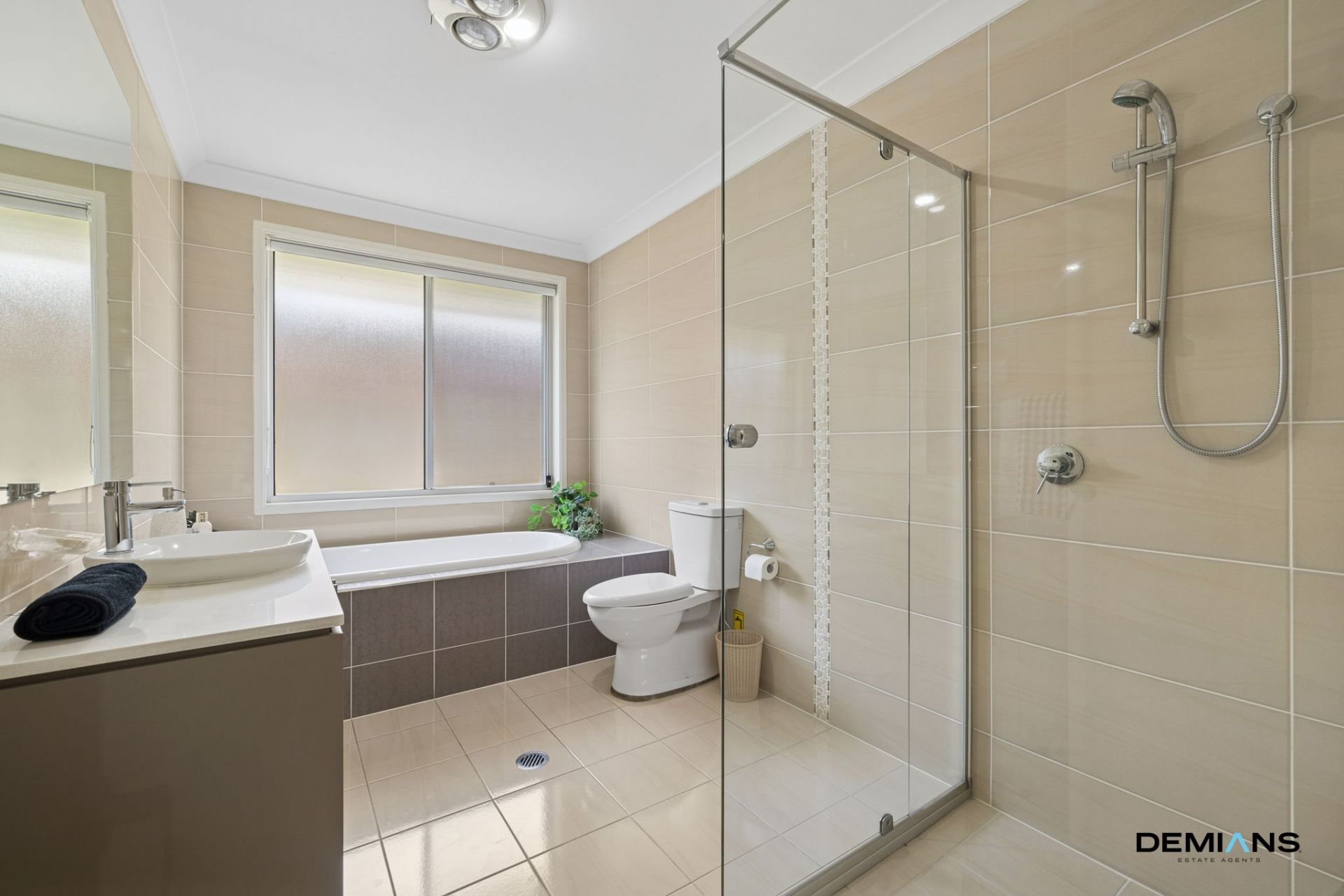 A modern main bathroom continues the home's refined aesthetic with a large shower, spacious bathtub and quality fittings.