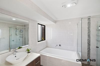 The main bathroom impresses with an oversized shower, stunning finishes, and a modern aesthetic that perfectly complements the home.