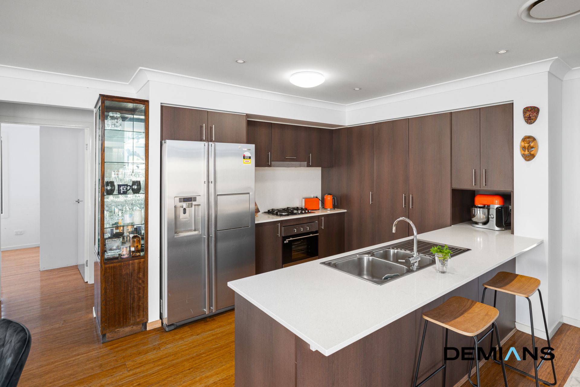 The gourmet gas kitchen is a true focal point, featuring sleek stone benchtops, a striking splashback, high-end stainless steel appliances, a breakfast bar, and ample storage space, making it a dream for home chefs.