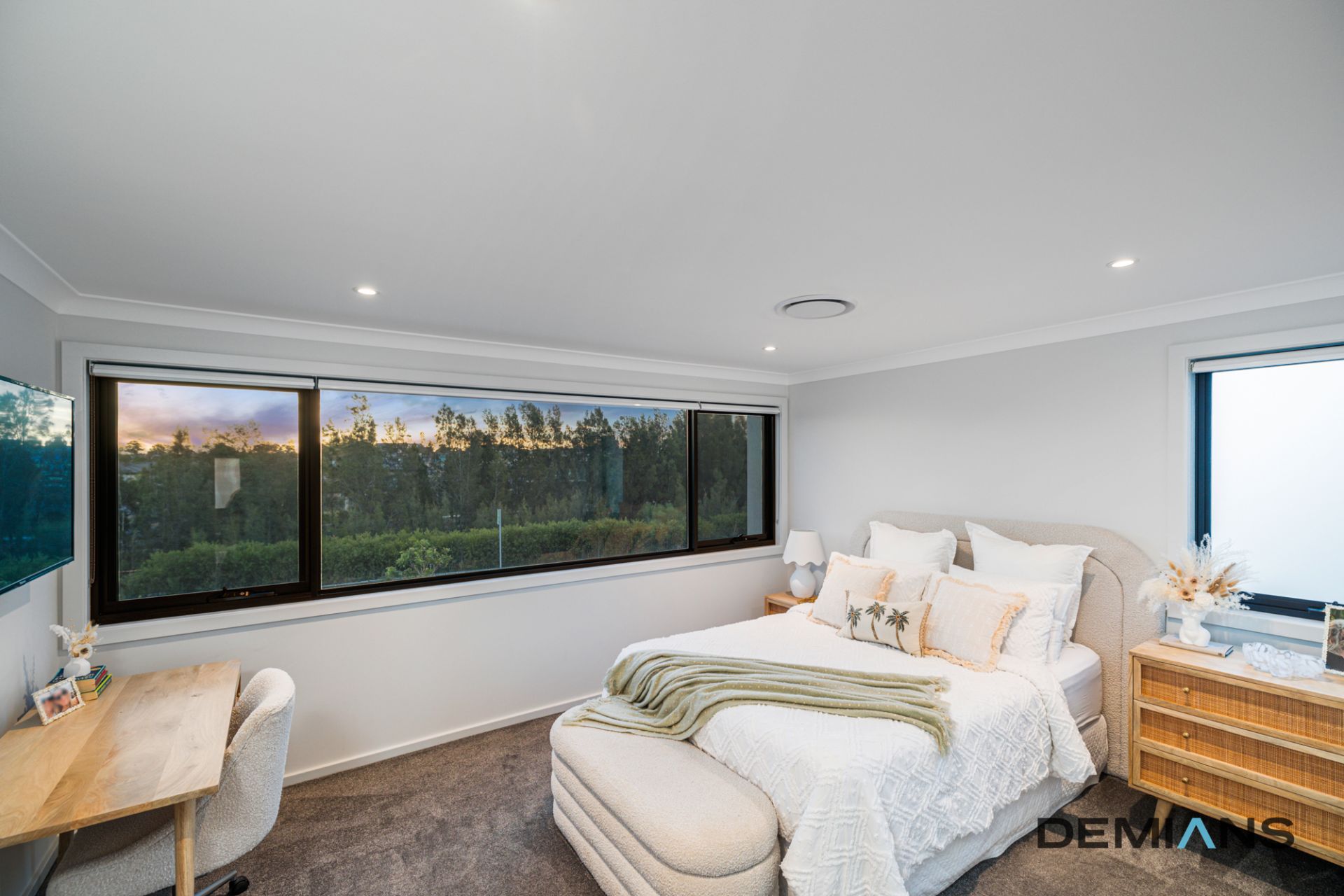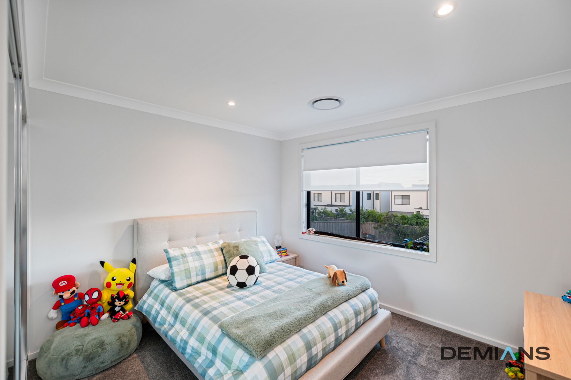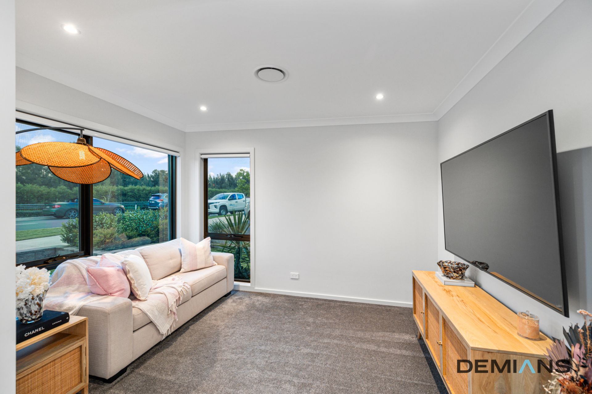 A carpeted multipurpose room at the front of the home provides the perfect space for a second living area, home office, or guest bedroom. A conveniently located powder room and understairs storage add practicality, while high ceilings and modern downlights elevate the home's sophisticated appeal.