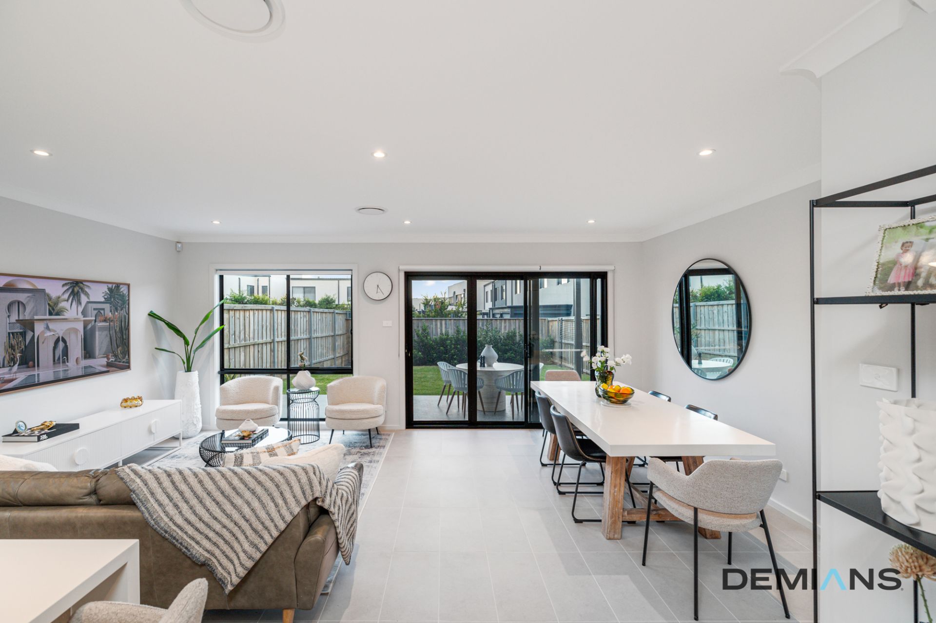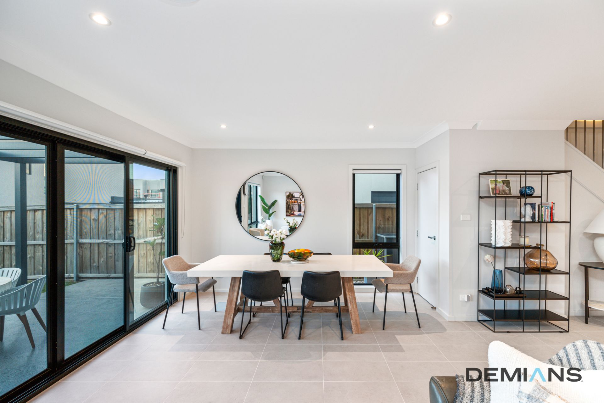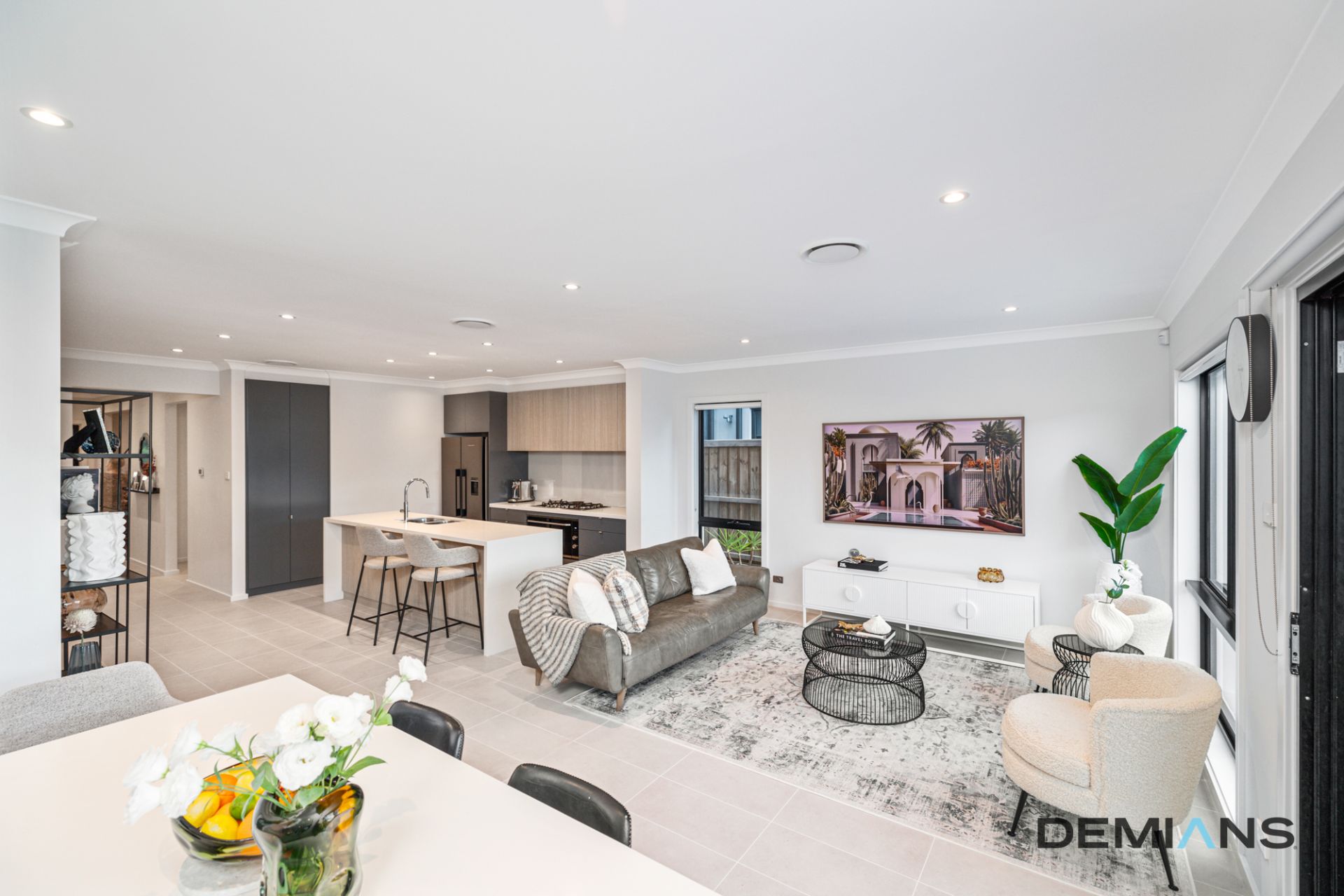 Step inside to be greeted by a seamless open-plan design, where natural light floods the interiors through plantation shutters, enhancing the warmth of the tiled flooring.