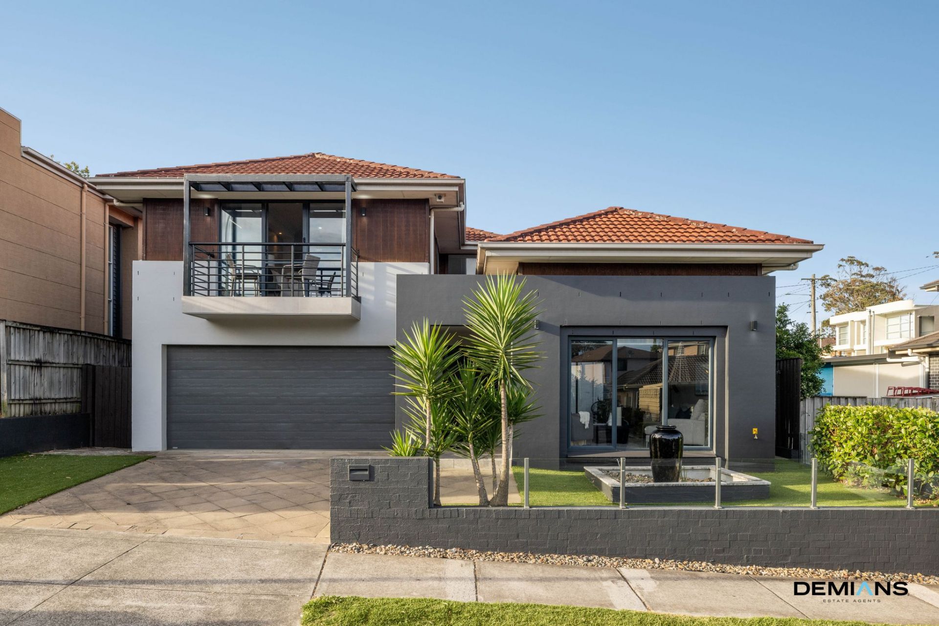 A wide driveway leads to a double garage and a private, landscaped front courtyard complete with a water feature, setting the tone for what lies beyond.