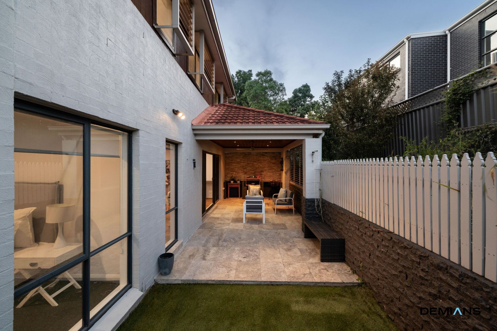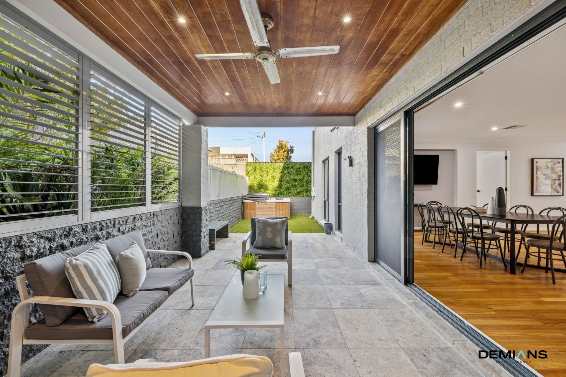 Towards the rear, the main alfresco provides a more intimate setting with a timber-lined ceiling, stone feature wall, shutters for privacy and a ceiling fan for comfort. Whether it's weekend barbeques, warm evenings with friends or a quiet morning coffee, the outdoors is designed to be enjoyed year-round.