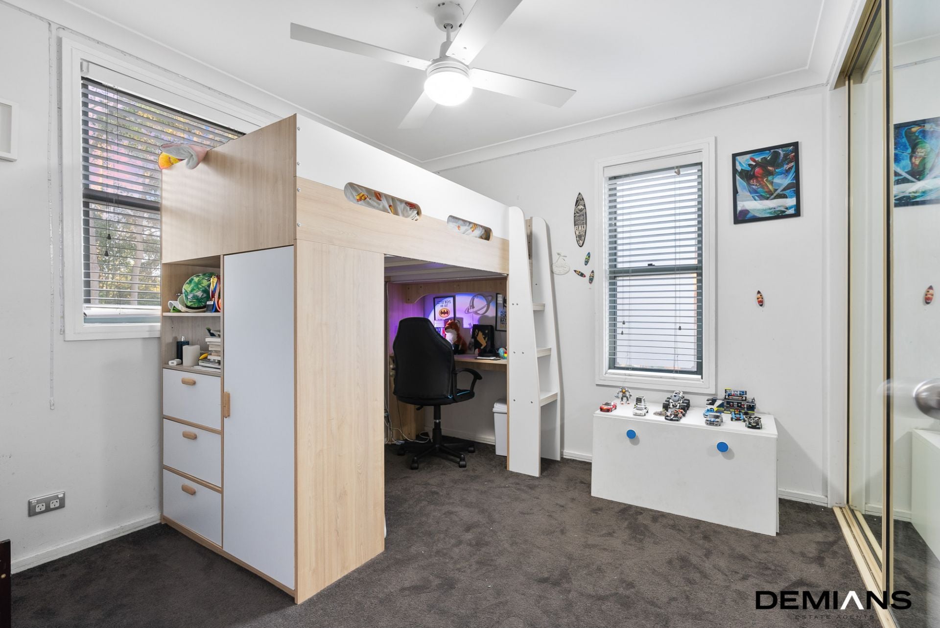 Upstairs, three oversized bedrooms provide built-in wardrobes and ceiling fans for added comfort.
