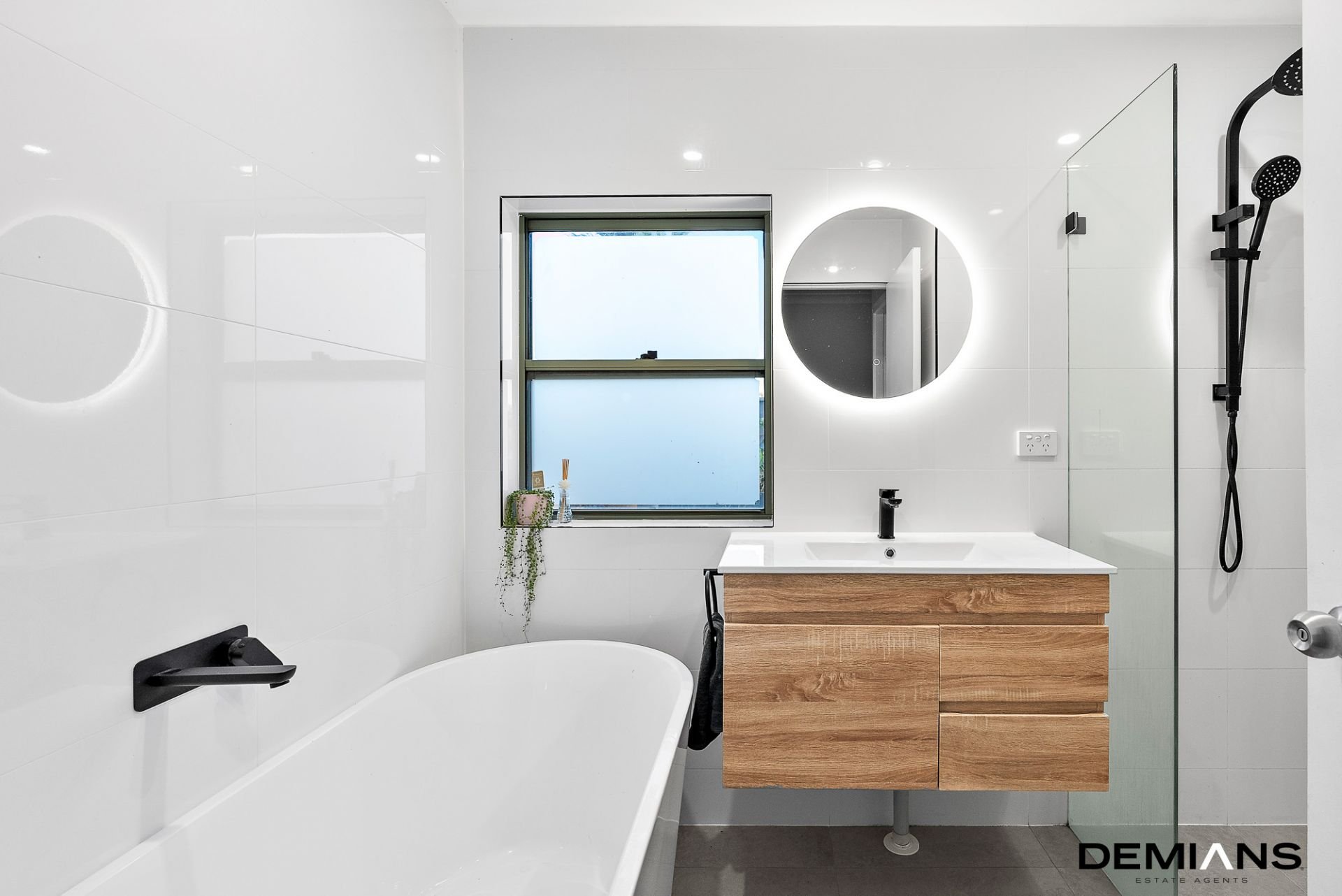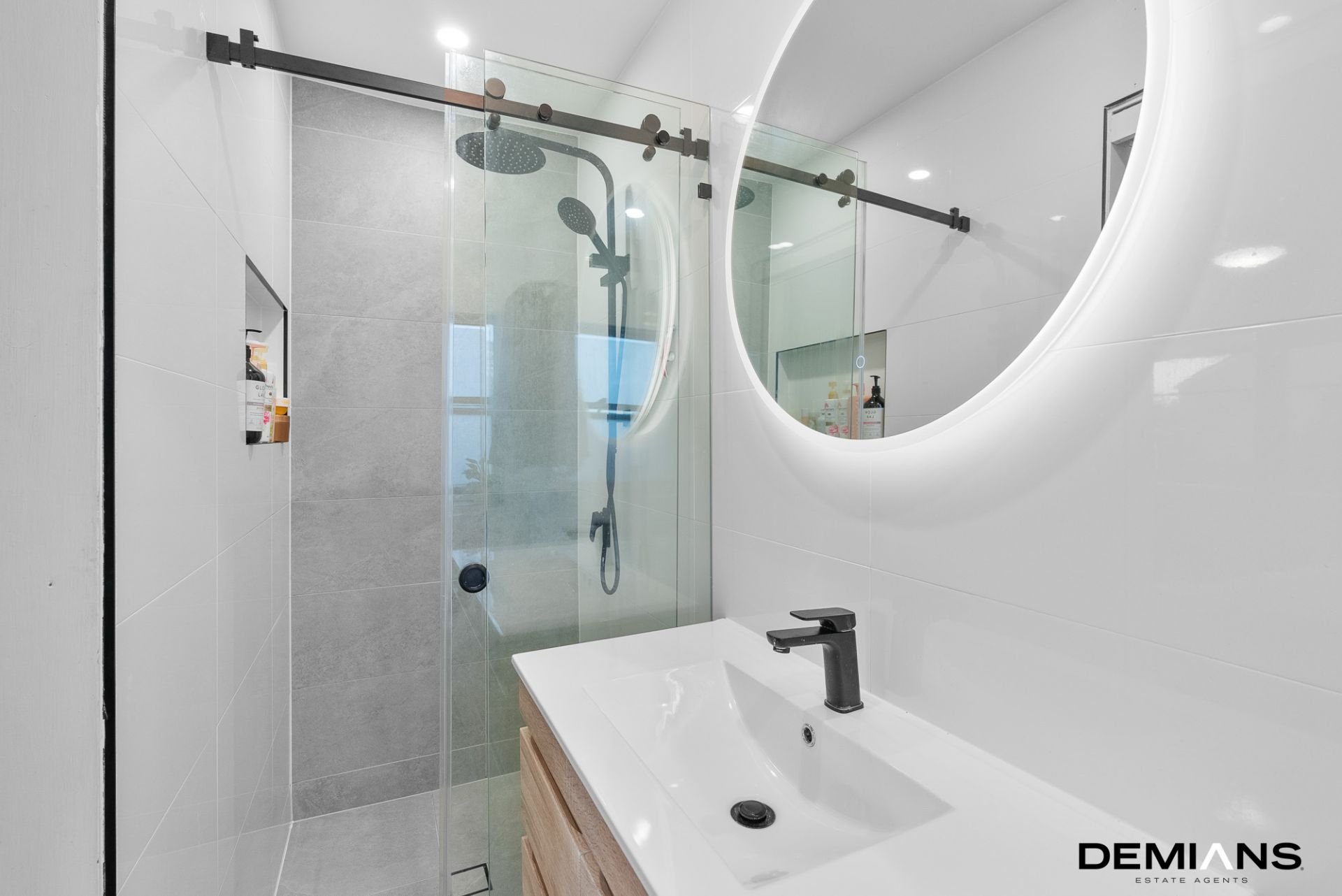 The master suite boasts a private entertainer's balcony and a luxurious ensuite with floor-to-ceiling tiles and a floating vanity.