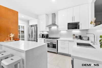 The gourmet gas kitchen is a chef's dream, with Caesarstone benchtops, soft-close drawers, ample cupboard space, and quality stainless steel appliances.
