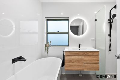 The main bathroom is equally impressive, featuring a luxurious bathtub, a floating vanity, and a separate toilet.
