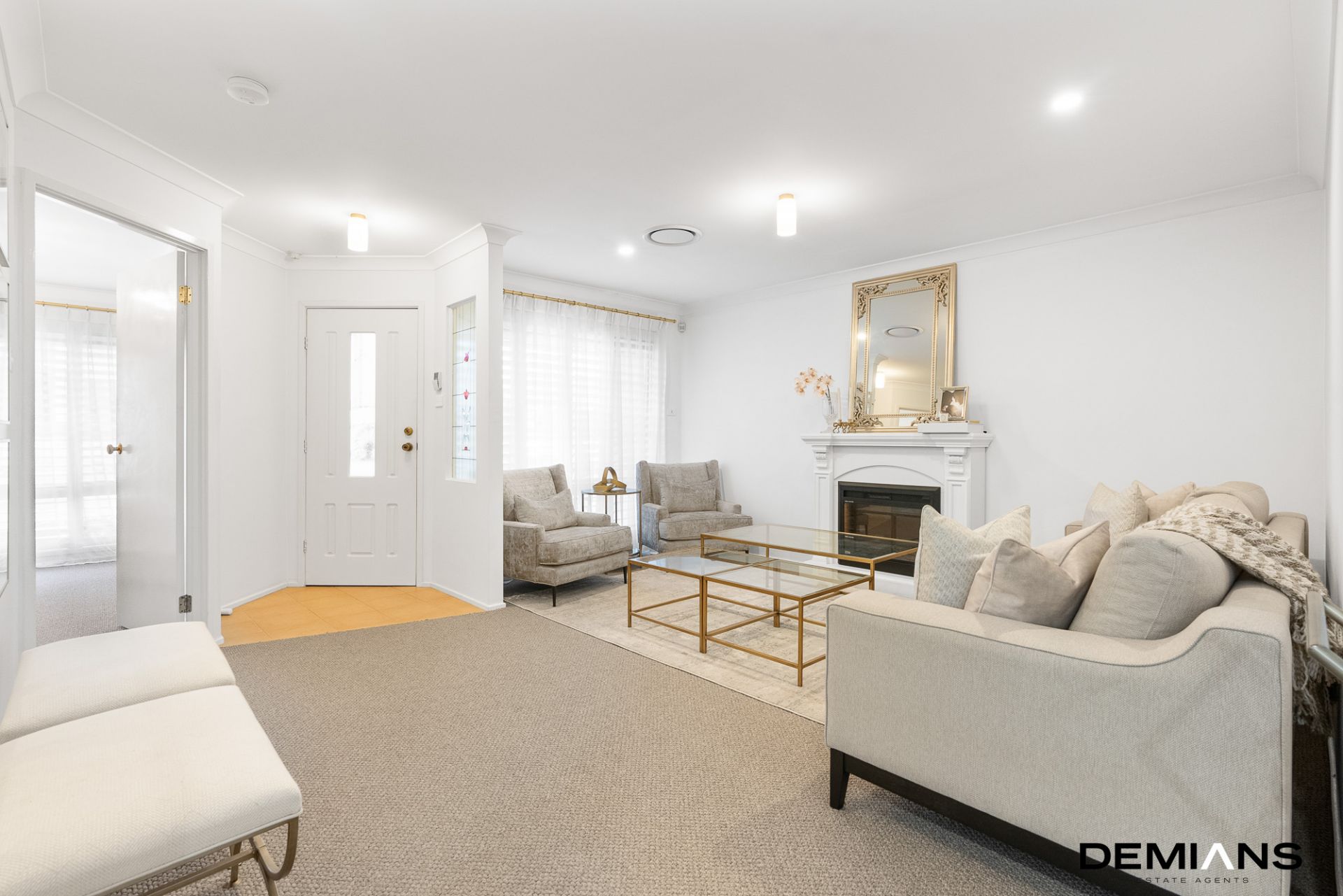 The home opens to a light-filled front living area complete with a cozy fireplace, perfect for relaxing evenings, while an adjacent open-plan study offers a stylish and practical workspace.